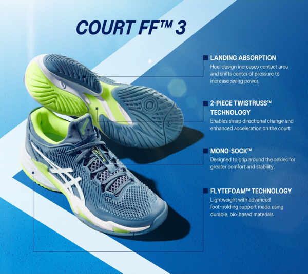 Кроссовки Court FF 3 для игрока, который с легкостью может переключаться между игрой в стиле «линия подачи» и в стиле «лучшее из обоих стилей игры». Стабильные, гибкие и быстрые кроссовки.