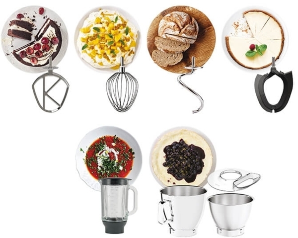 Стандартная комплектация данной кухонной машины включает металлический венчик для взбивания, фирменная К-образная насадка для смешивания, крюк для замешивания густого дрожжевого теста, гибкий взбиватель (для кремов), стеклянный блендер, а также прозрачную защитную крышку от разбрызгивания, устанавливаемую на чашу. Основная чаша на 7 л и дополнительная на 5 л. Основа кухонной машины оснащена встроенными электронными весами, что точно вам пригодится для точного соблюдения пропорций ингредиентов. Кухонная машина может работать без вашего участия автоматически, по таймеру (до 30 минут). Также предусмотрено 8 скоростей и режим импульсного смешивания.