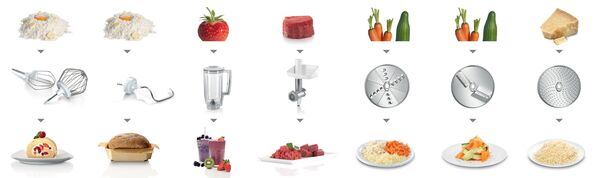 Не останавливайтесь на привычных блюдах - пробуйте новые! С широким ассортиментом дополнительных аксессуаров для MUM5 вам по плечу домашняя паста, мороженое, колбаски, выпечка и кремы. Экспериментируйте!