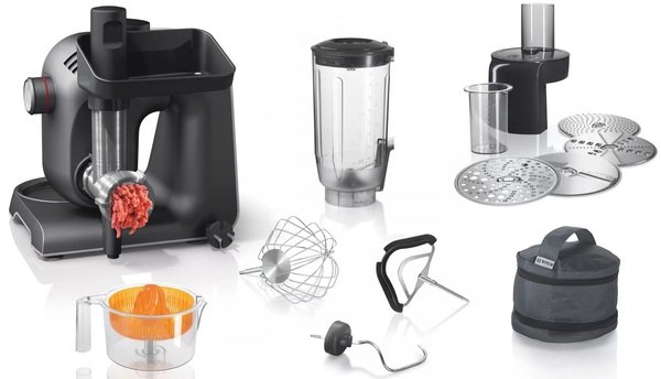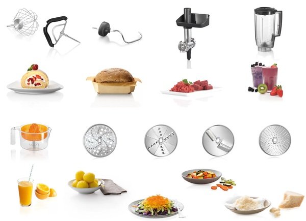 Доступен широкий ассортимент высококачественных аксессуаров, например, измельчитель, миксер, набор для приготовления теста, мясорубка, цитрус-пресс, блендер и т.д.