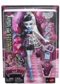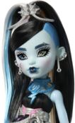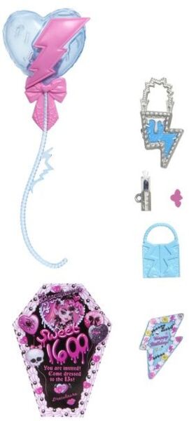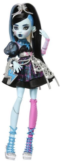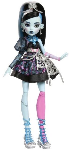 Кукла Monster High Страх какой сладкий день рождения Фрэнки готова зажигать на самой жутко-сладкой вечеринке столетия! Ведь Дракулаура празднует свои 1600 лет — а это идеальный повод для Бунтарства до самого утра. Её образ — это взрывная смесь готического гламура и панковского дерзкого стиля, которая точно не оставит равнодушным ни одного монстра. Праздничное платье сочетает чёрную прозрачную сетку и яркие неоновые принты в стиле граффити, создавая ультрамодный контраст тёмных и кислотных оттенков. Асимметричные детали добавляют настоящий рок-н-рольный драйв: одна рука прикрыта объёмным рукавом из чёрной сетки, а другая — стильным отдельным розовым нарукавником, который выглядит особенно вызывающе. На талии — массивная серебристая накладка, похожая на пояс из переплетённых шестерёнок, отсылающая к лабораторным экспериментам. Завершают образ крупные серьги, голубой чокер-подвеска в форме молнии и серебристая заколка в виде цепи с острыми шипами — символы её электрической энергии. На ногах Фрэнки — высокие серебристые босоножки на платформе с голубыми ремешками, а яркий розовый протез на одной ноге создаёт невероятный контраст. Причёска куклы — это настоящий стильный микс: длинные чёрные волосы с белыми прядями и яркими синими локонами собраны в высокий хвост. Макияж тоже достоин отдельной похвалы: графичные стрелки, серые тени и чёрно-синяя помада подчёркивают смелый характер монстро-ученицы.