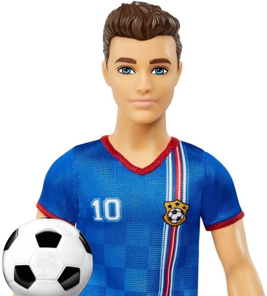 Этот набор содержит куклу Кена с каштановыми волосами, который одет в синюю футболку с номером "10" и эмблемой команды, а также черные шорты, спортивные красные гетры и бутсы. Из аксессуаров у него есть мяч, благодаря чему можно воспроизводить различные увлекательные моменты игры: забивать голы, передавать пас и представлять себя крутым футболистом. Детям понравятся безграничные возможности для творческого самовыражения.