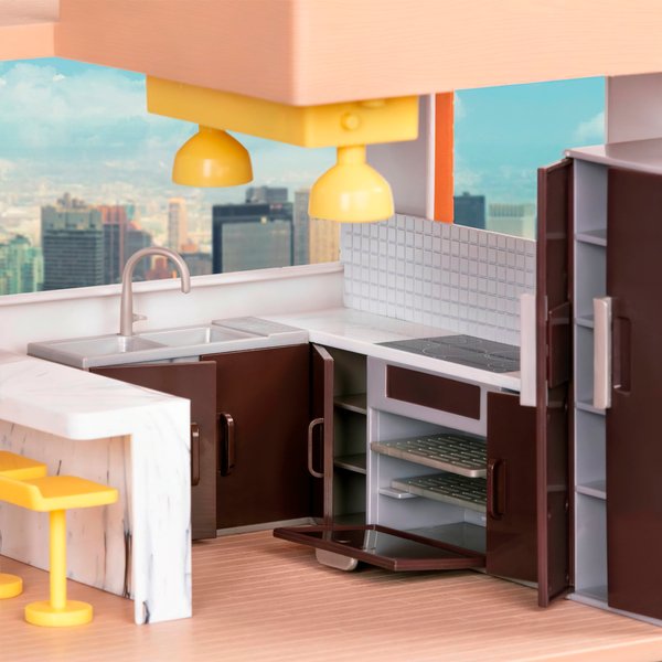 На главном этаже есть встроенный камин и великолепная кухня с рабочим кухонным освещением, чтобы зажечь изысканную вечеринку! Кухня полностью оборудована мойкой, плитой, духовкой, холодильником и подвижным кухонным островом из искусственного мрамора. Поднимитесь по лестнице на второй этаж, и продолжайте подъем на террасу на крышу, чтобы получить лучший вид в городе! Полностью открытая сторона и функциональные входные двери позволяют наслаждаться игровыми площадками как внутри, так и снаружи. Соберите все стильные наборы игрушек Lori, чтобы оформить свой город так, как вам хочется.