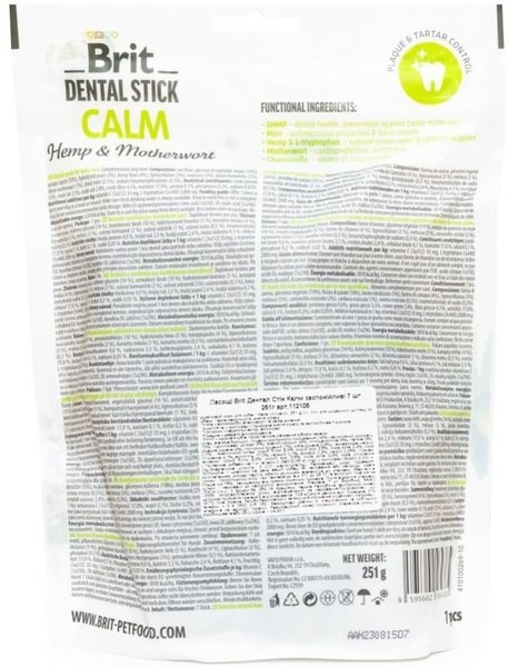- Лакомства для собак Brit Dental Stick Calm успокаивающие, конопля с пустырником 251г