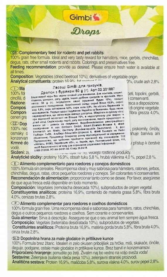 Продукты GimBi - это высококачественные лакомства, которые дополняют ежедневный рацион домашних декоративных грызунов. Они способствуют здоровому самочувствию и правильному развитию питомцев. Вкусные беззерновые закуски с очень легким ароматом. Именно поэтому их любят декоративные грызуны, ведь они избегают слишком ароматных продуктов. Регулярное употребление такого лакомства не вызывает никаких проблем с желудочно-кишечным трактом. Консистенция дропсов делает их безопасными даже для тех домашних животных (хомяки), которые временно вводят пищу в щечные мешочки.