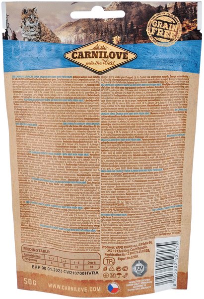 лосось 55% (40% сушеный лосось, 15% свежий лосось), тыква 12%, желтый горох 8%, куриный жир (консервированный токоферолами 7%), соус из лосося 5%, мята 4%, морковь 2%, нут 2%, сушеное яблоко 2%, льняное семя 2%, льняное масло 1%.