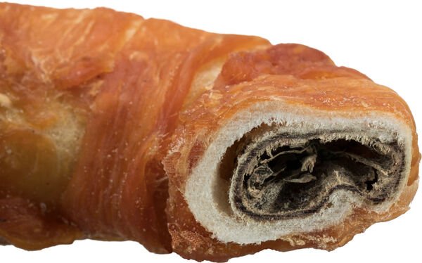 Жевательное кольцо из сыромятной кожи с куриной мясной оболочкой, наполненный говяжьей печенью и лёгкими для собак. Позволяют побаловать или поощрить питомца с пользой для здоровья его ротовой полости. Представляет собой аппетитное жевательное угощение, позволяющее разнообразить рацион питомца и удовлетворить его жевательный рефлекс. Сыромятная кожа при жевании помогает контролировать образование зубного налёта и зубного камня, что положительно влияет на гигиену ротовой полости собаки.
