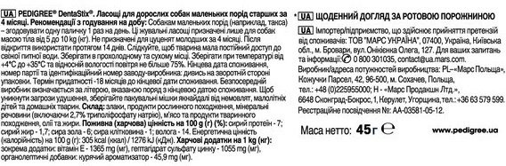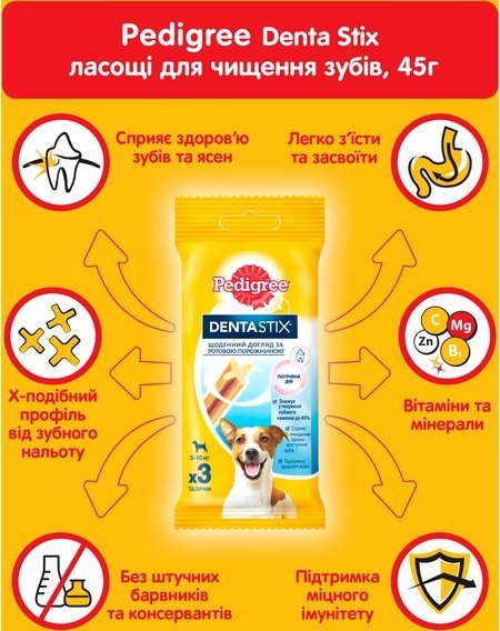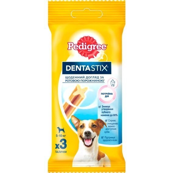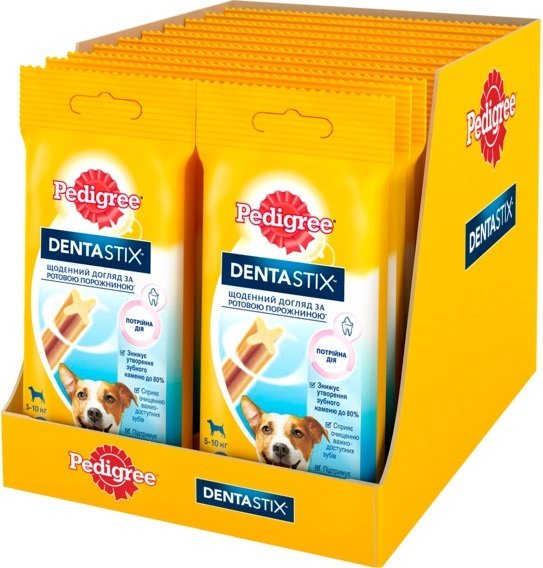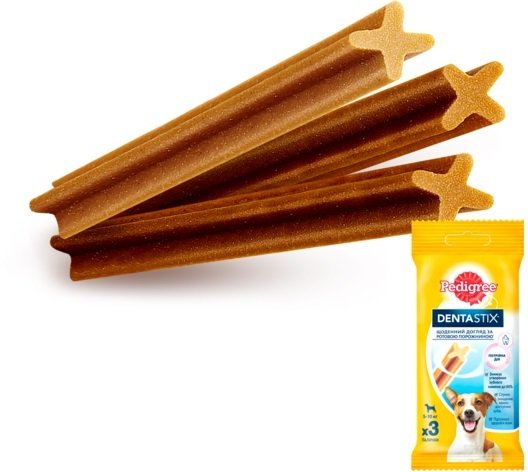 Pedigree Denta Stix — жевательное лакомство для собак малых пород от 5 до 10 кг. Разработано специалистами Waltham (Великобритания), с целью заменить вредные для животного "лакомства со стола хозяина", обладает функциональной активностью – очищает зубы собак от зубного налета и профилактирует образование зубного камня, так же, обладает высокой вкусовой привлекательностью! Без содержания: искусственных красителей, консервантов, ароматизаторов и усилителей вкуса.