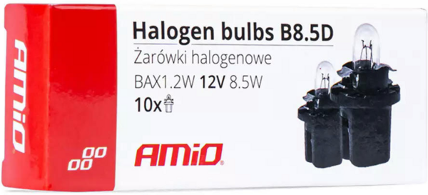 Лампа Amio (03371) - это комплект из десяти галогенных ламп, предназначенных для использования в автомобильных фарах с байонетным креплением B8,5D. Эти лампы обеспечивают мощное освещение при напряжении 12V и мощностью 8,5W, что делает их идеальным выбором для салона.