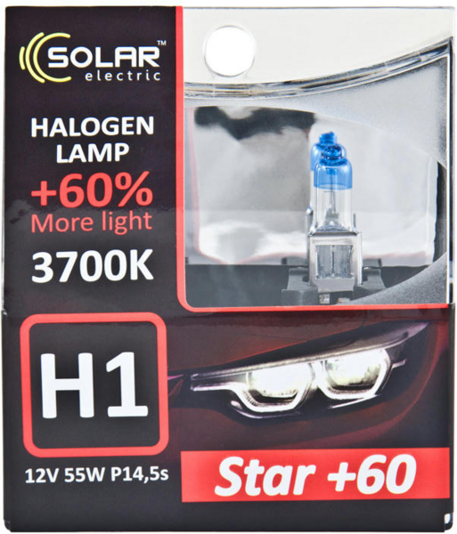 Это галогенная лампочка, серии Star от компании Solar, в производстве которых применяются инновационные технологии с использованием высококачественных материалов. Они отличаются увеличенной светоотдачей на 60% по сравнению с лампочками стандартной модификации, луч длиннее на 35 метров, это повышает безопасность и комфорт передвижения в любое время суток и при любых погодных условиях. Тип цоколя Н1/P14,5s, применяется для фар головной оптики, а именно ближнего света, дальнего света и противотуманного. Установка очень проста, Вы это можете сделать самостоятельно, в домашних условиях, главное не прикасаться к колбе лампочки, что бы не оставлять отпечатки пальцев, а так же желательно ее предварительно протереть спиртом. Конструкция лампочек устойчива к вибрациям, а размер соответствует стандартам посадочных мест в фаре. Они считаются фланцевыми, с ограниченным расстоянием между металлическим фланцем и спиралью. Колба частично прозрачная, а вверху окрашена в синий цвет, изготовлена из качественного стекла, оно более прочное и сокращает воздействие вредного ультрафиолета.