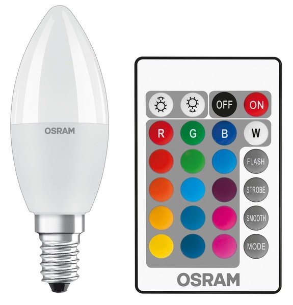 - Лампа светодиодная Osram Led E14 4.5W 2700К+RGB 470Lm В40 + пульт ДУ (4058075430853)