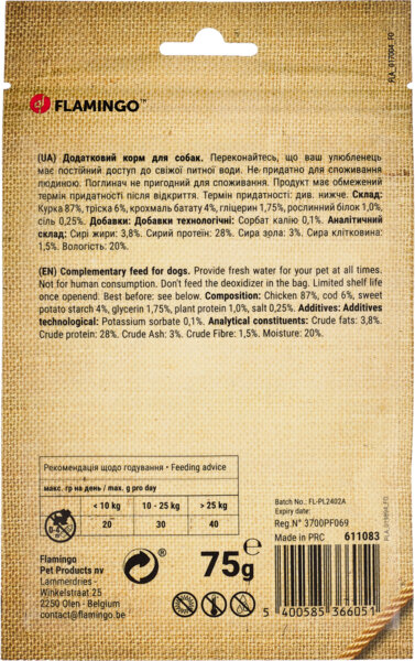 - Лакомства для собак Flamingo маленькие треугольники с курицей и треской 75 г