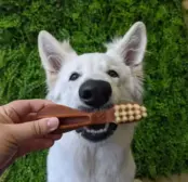 - Как и в случае с любым съедобным продуктом, следите за своей собакой, чтобы убедиться, что она тщательно пережевала лакомство;