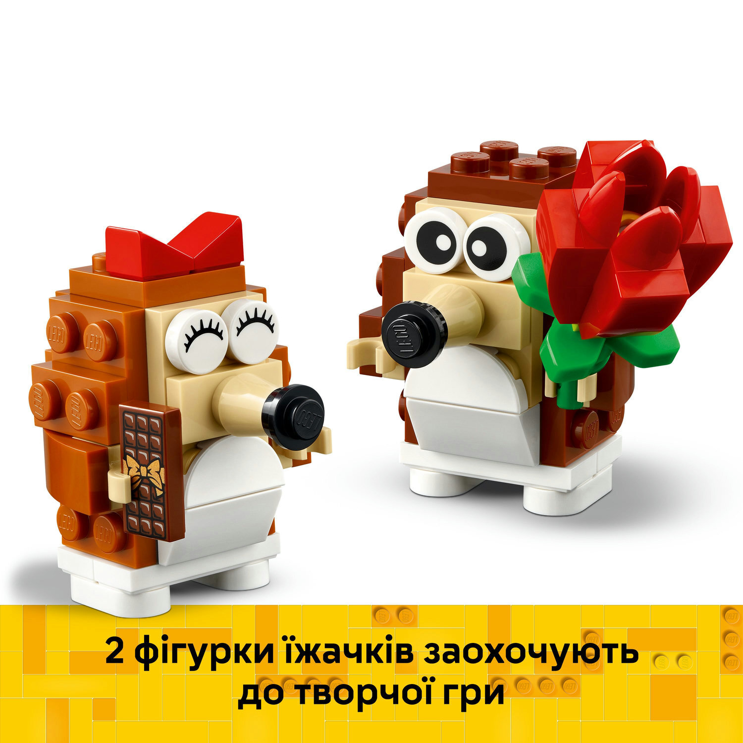 Этот яркий набор для конструирования LEGO наполнен дополнительными игровыми возможностями для детей. Ежиков можно отсоединить от скамейки, чтобы они могли свободно стоять, или же они могут сидеть и наслаждаться пикником с одеялом, розой, чашками, пирогом и жёлтой бабочкой. Они также могут держать чашки в лапках. Этот игровой набор станет отличным подарком LEGO на любой праздник, в том числе на День Святого Валентина, и может быть добавлен к другим наборам для конструирования LEGO (продаются отдельно), чтобы дети могли наслаждаться ещё большим количеством историй о животных. После завершения игры ежики станут отличным экспонатом на полке или тумбочке у кровати.