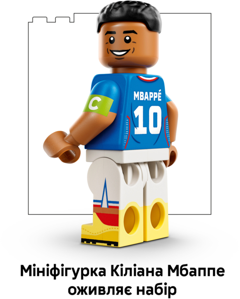 В набор входит коллекционная табличка с его статистикой и подписью, а также минифигурка Мбаппе, которая оживляет набор.