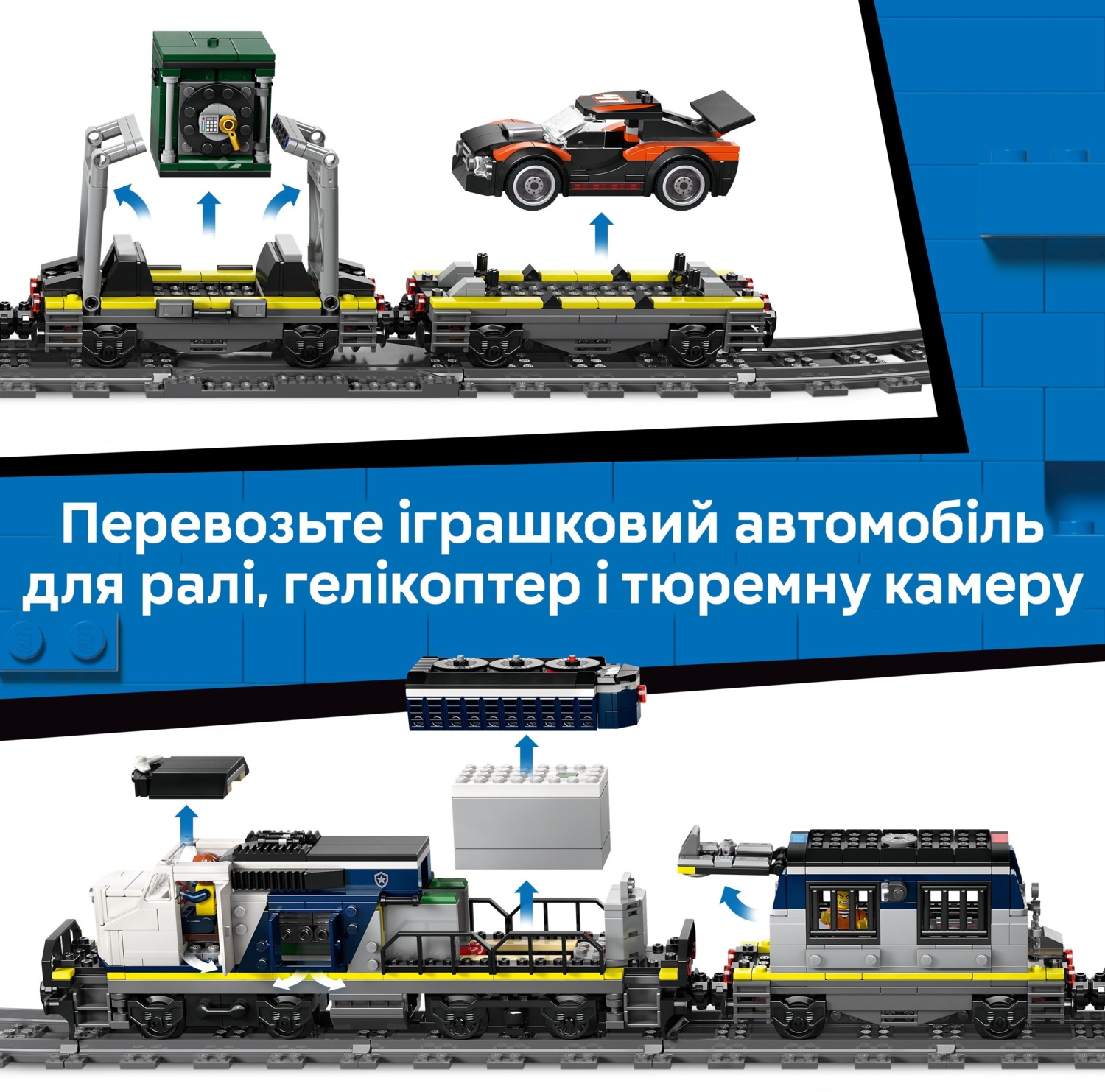 Все на борт для непрерывных приключений с игрушечным набором LEGO City Ограбление полицейского поезда. Этот электрический поезд с электропитанием имеет рабочий локомотив и 3 платформы, на которых размещены тюремная камера, банковский сейф и автомобиль для ралли.