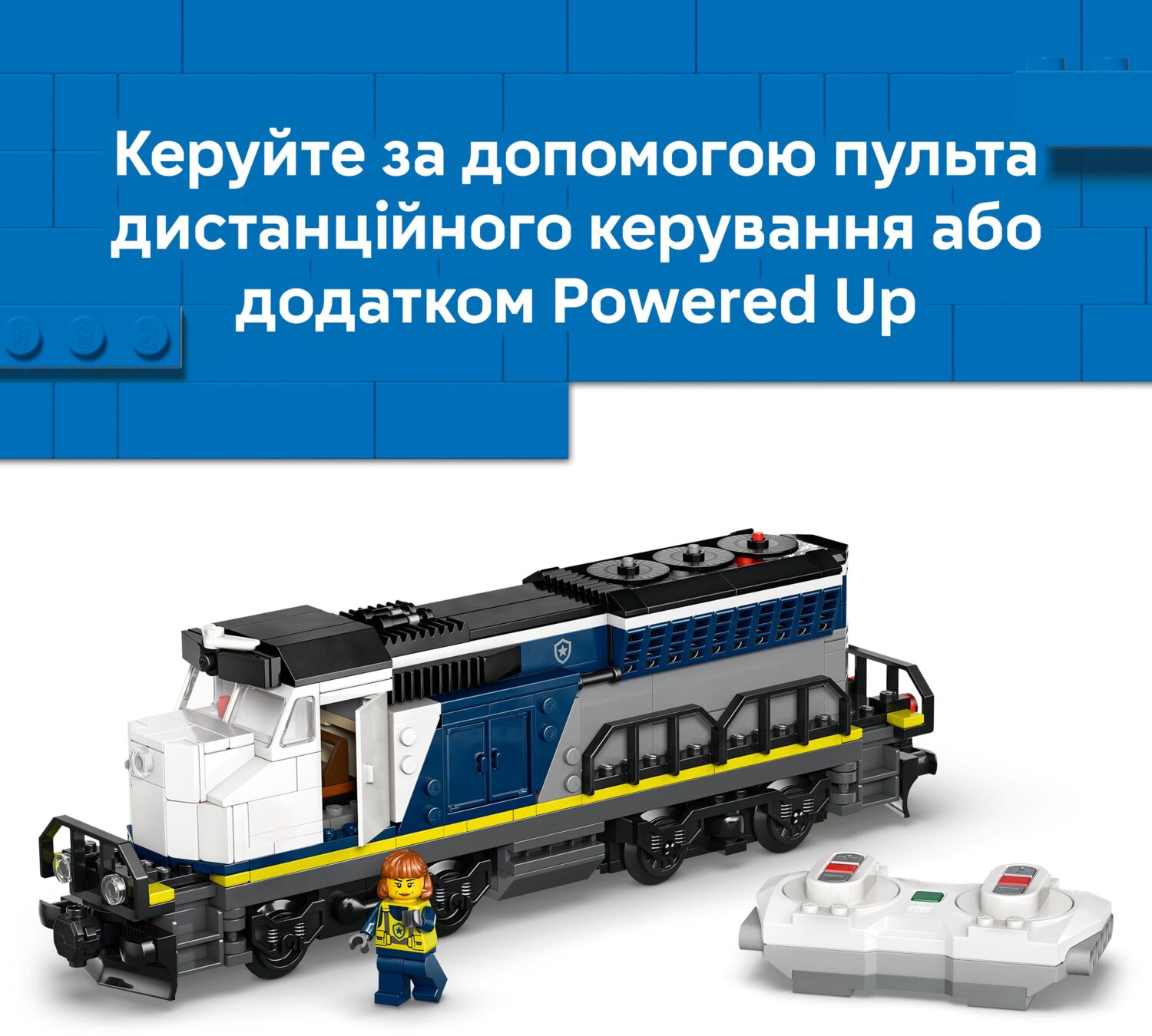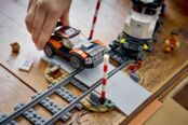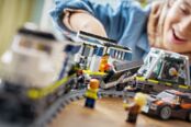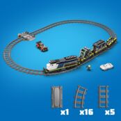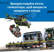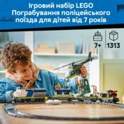 Набор также содержит овальную железнодорожную колею с железнодорожным переездом и путевой секцией для возврата поезда на рельсы. В комплекте также модель вертолета с когтем для захвата и минифигурки детектива, полицейского, машиниста поезда и 3 преступников, чтобы устроить фантастические приключения с ограблением поезда.