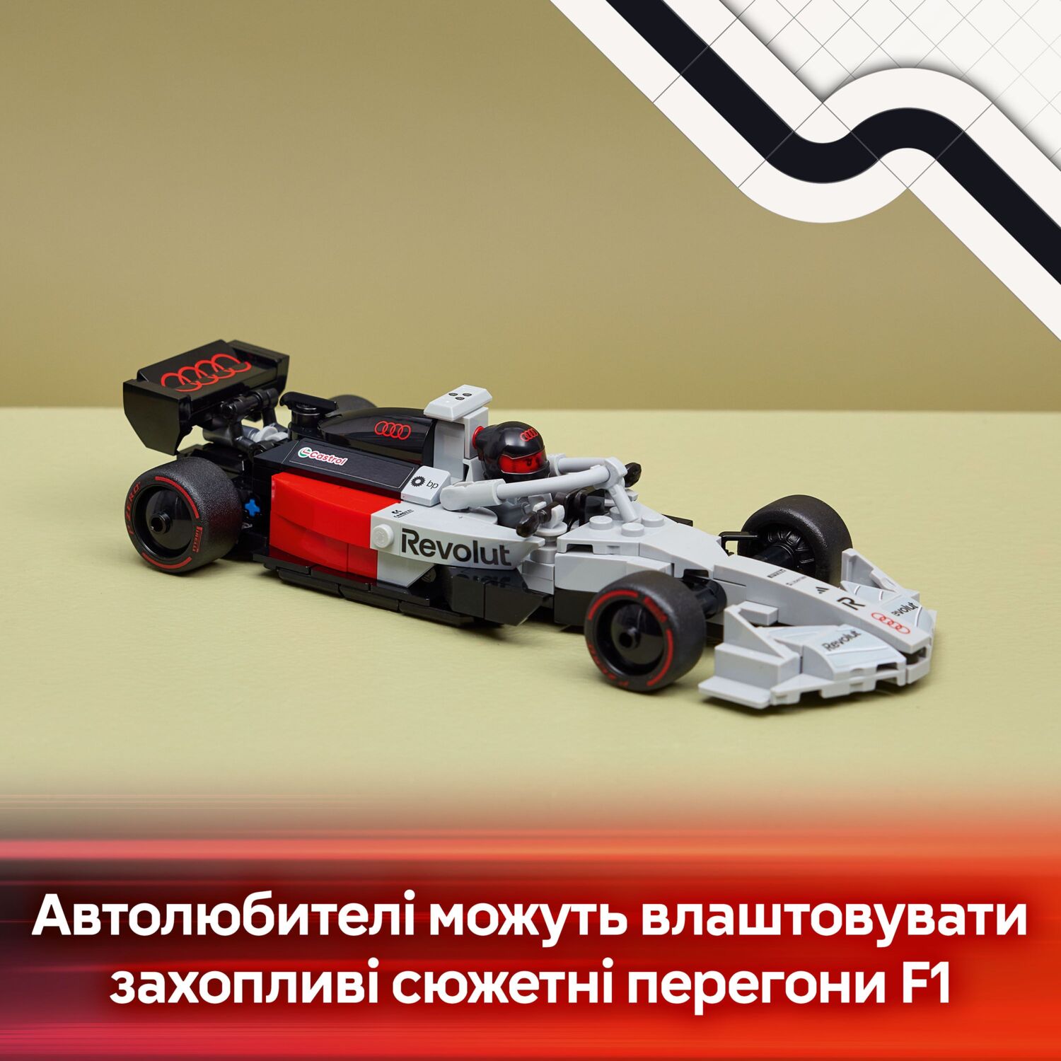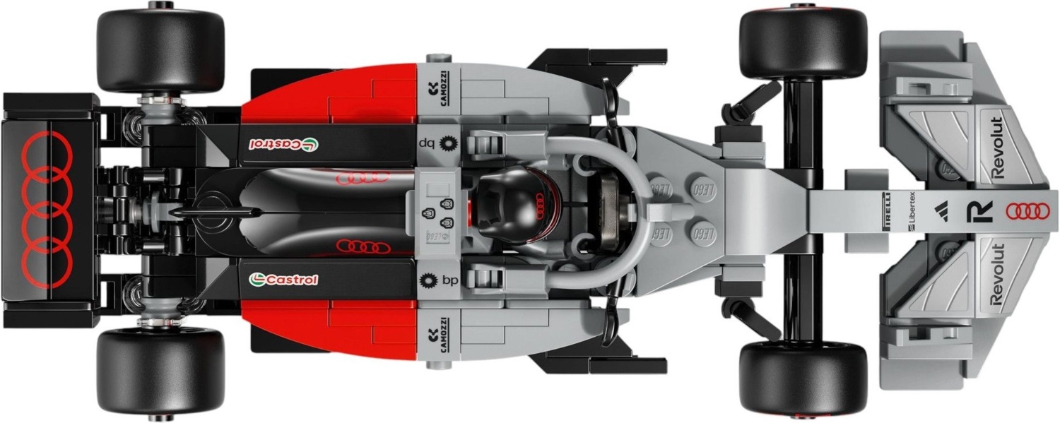 Гоночный автомобиль Audi Revolut F1 Team R26 имеет кабину пилота, заднее крыло, аутентичные логотипы спонсоров, переднюю подвеску и шины с надписью Pirelli. Игрушечный болид также комплектуется минифигуркой в форме Audi Revolut F1 Team с шлемом, которую можно разместить в кабине пилота и устроить гонки.