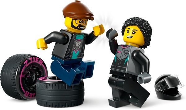 В комплект входят минифигурки водителей для игрушечного грузовика и гоночного автомобиля.