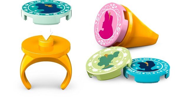 4 здания с множеством деталей, 4 мини-фигурки LEGO Disney и маленький игрушечный фонтанчик, который можно сложить, чтобы начать игру.