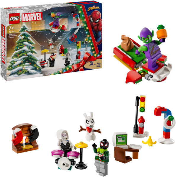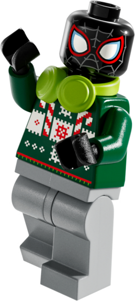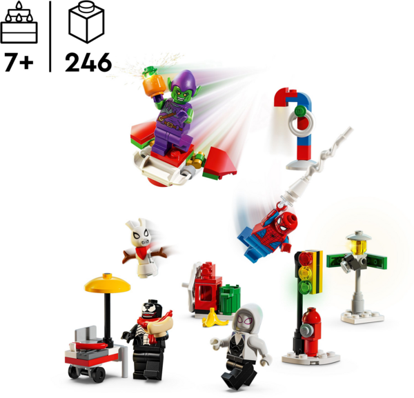 В наборе есть 5 минифигурок (Человек-паук, Зеленый Гоблин, Майлз Моралес, Паук-призрак и Веном), а также маленькие конструкторы и аксессуары, которые дети узнают из сцен на улицах Нью-Йорка в фильмах о Человеке-пауке. Среди них - снежный Свино-Паук, письменный стол Питера Паркера и елка Электро. В наборе также есть 2 маленькие машинки, которые могут соревноваться друг с другом, и катапульта Песчаного человека, метающая подарки! С приближением большого дня дети могут смешивать подарки, чтобы самостоятельно придумывать бесконечные собственные приключения.
