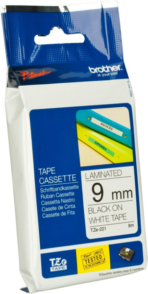 Лента Brother для принтеров этикеток ламинированная, черный на белом 9 мм 8 м (TZE221)
