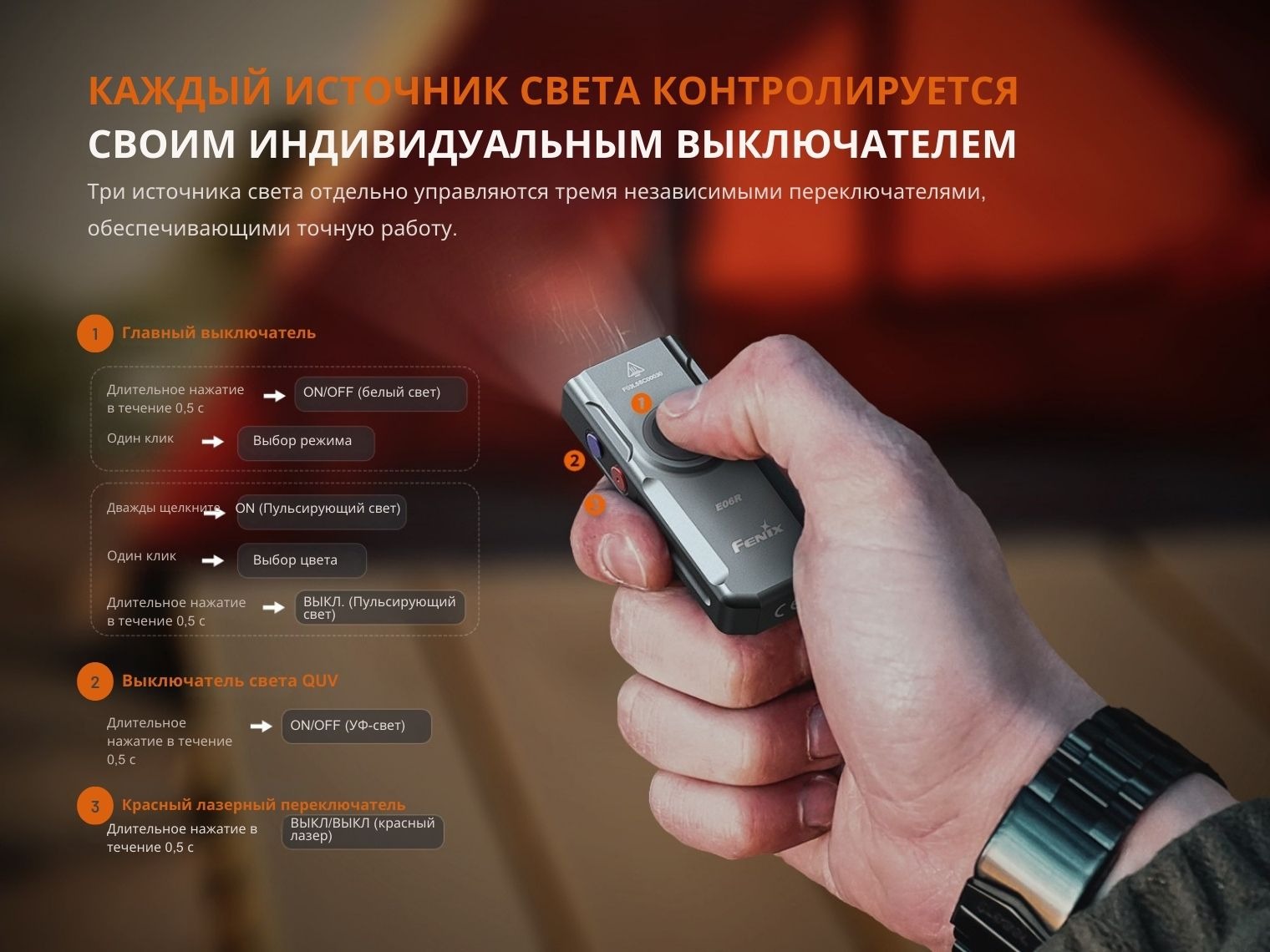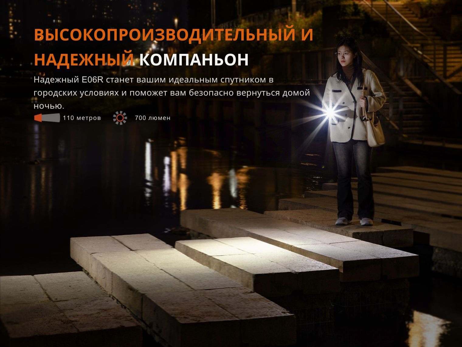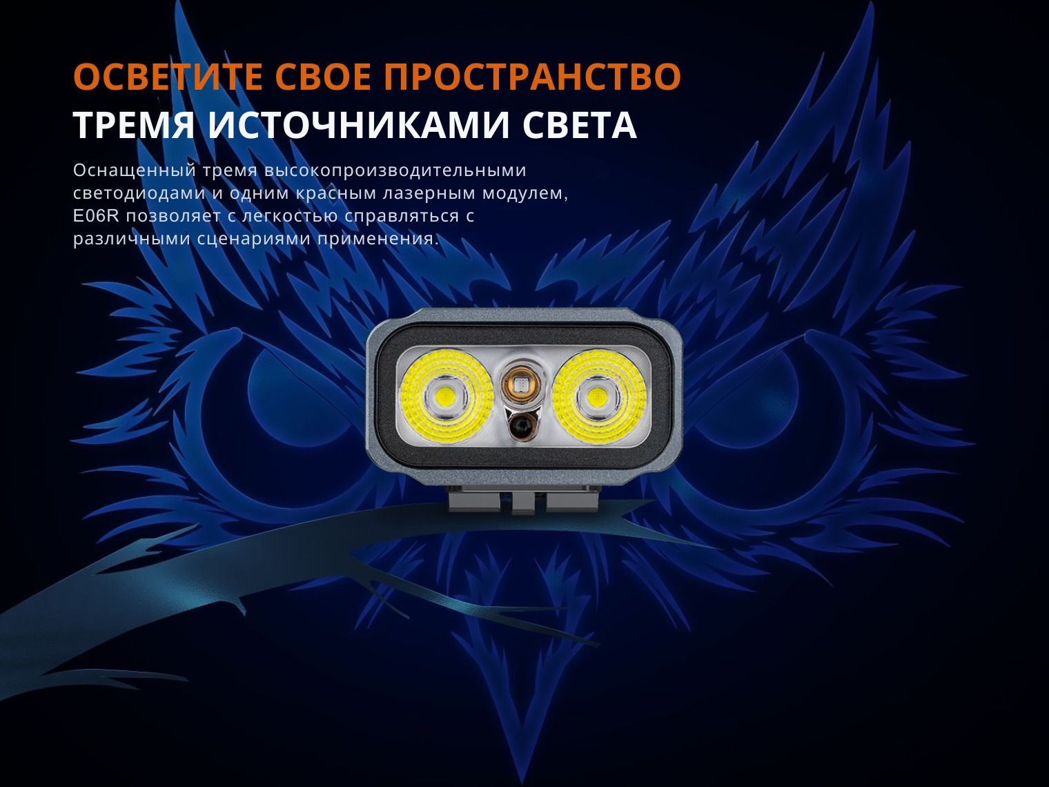В фонаре Fenix E06R доступны 10 режимов, включая белый свет яркостью до 700 лм, УФ-свет 365 нм, мигающие режимы красного и синего цвета, а также красный лазер. Питание от встроенного аккумулятора 750 мАч с зарядкой через порт USB-C. Гибкая настройка света с помощью трех переключателей. Цельнометаллический корпус с анодированием против коррозии. Герметичность по стандарту IP66.