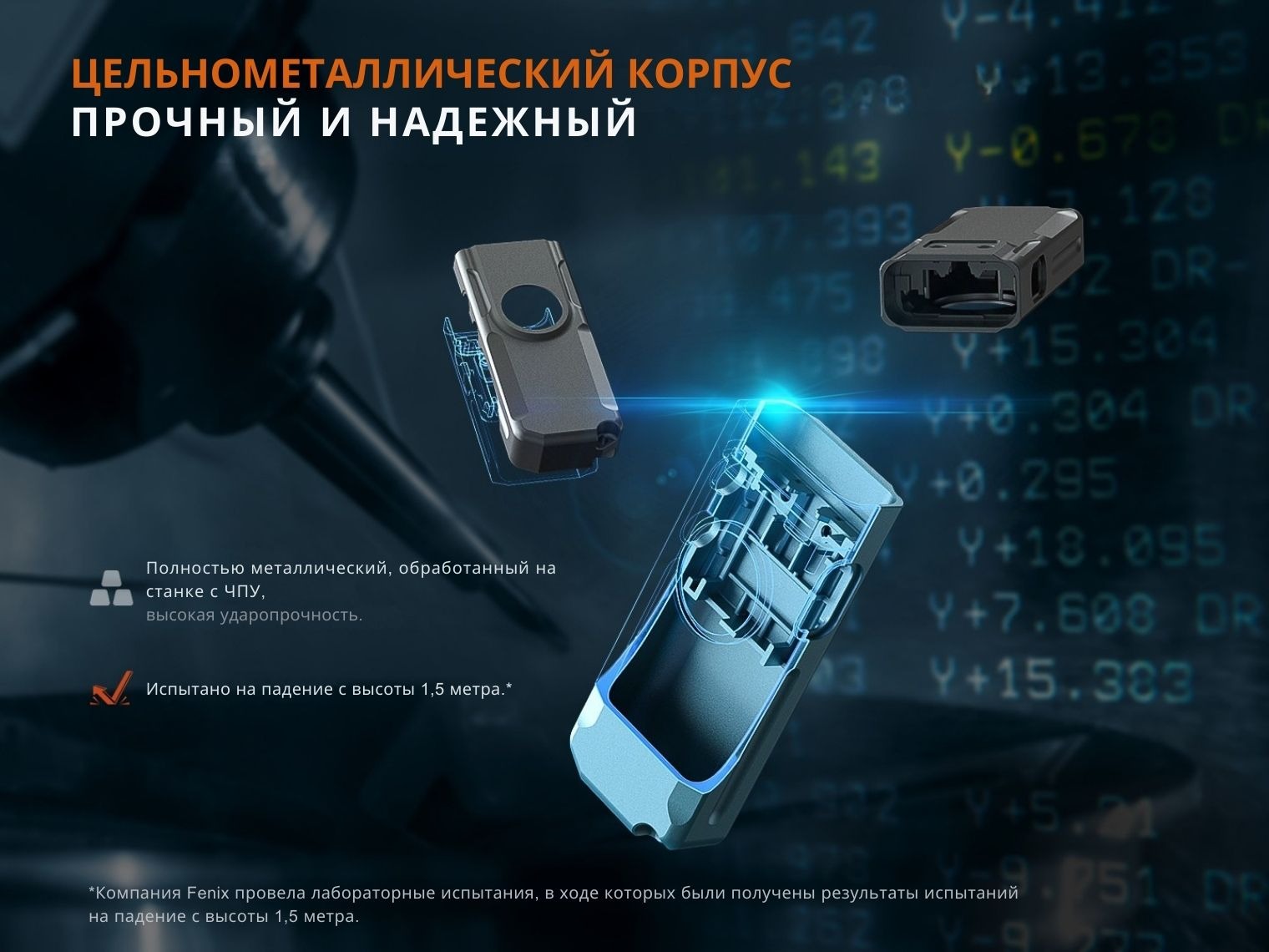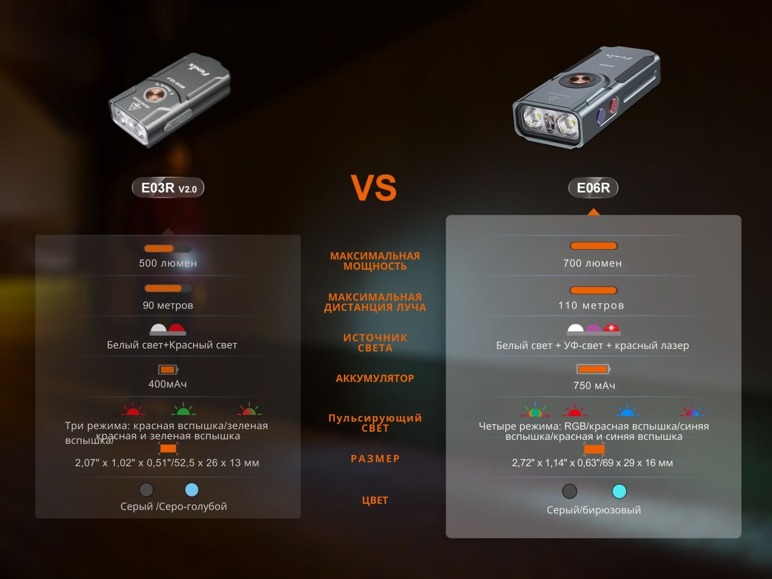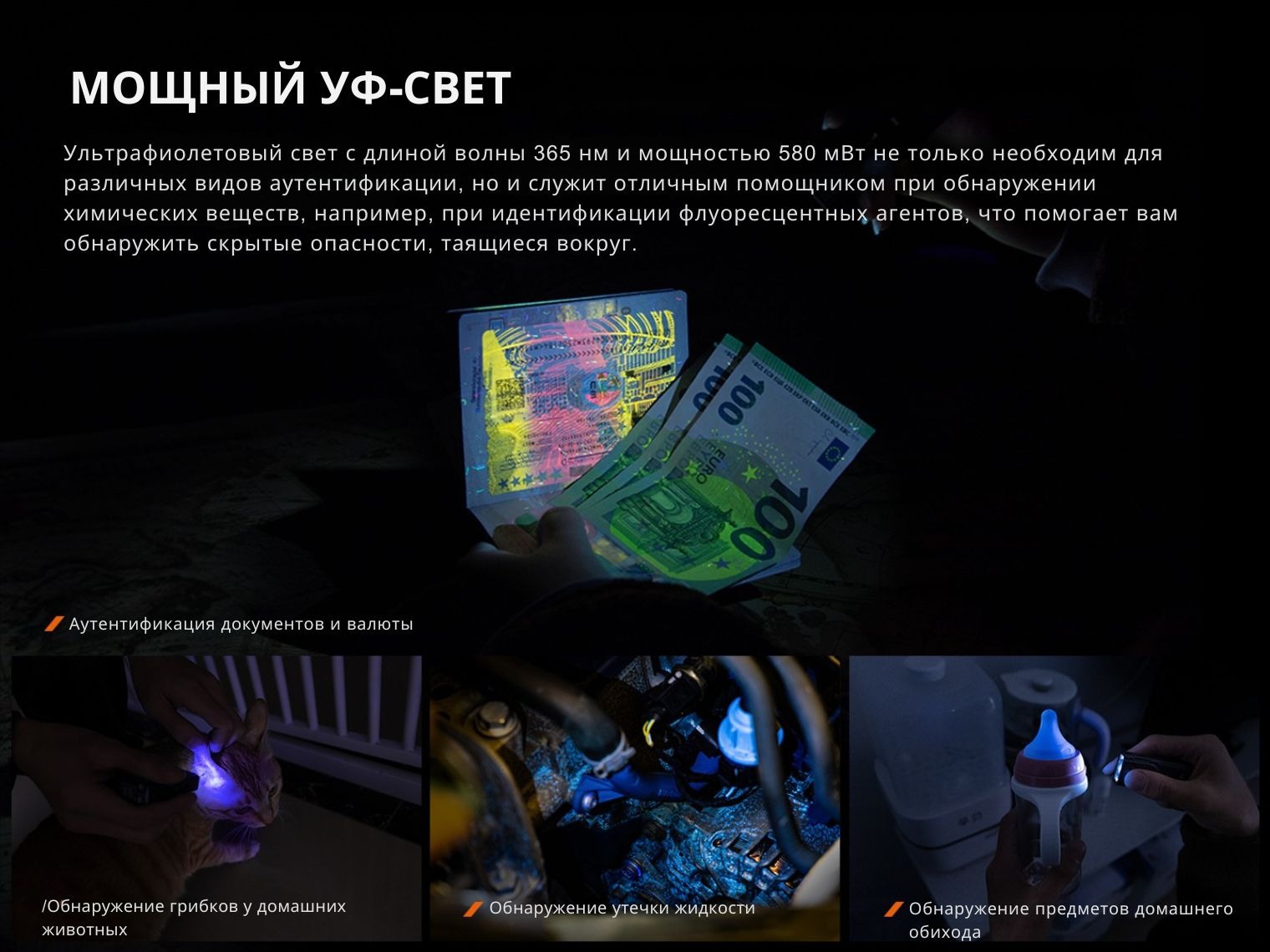 В фонаре Fenix E06R доступны 10 режимов, включая белый свет яркостью до 700 лм, УФ-свет 365 нм, мигающие режимы красного и синего цвета, а также красный лазер. Питание от встроенного аккумулятора 750 мАч с зарядкой через порт USB-C. Гибкая настройка света с помощью трех переключателей. Цельнометаллический корпус с анодированием против коррозии. Герметичность по стандарту IP66.