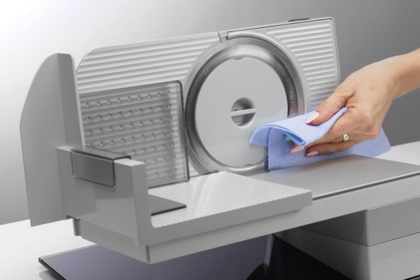 Кусочки пищи застревают между лезвием и корпусом, поэтому ломтерезку нужно тщательно чистить после каждого использования. Каретка снимается, поэтому у вас будет лучший доступ для безопасной очистки углублений, где застревают продукты. Лезвие следует протирать мягкой тряпкой и теплой водой.