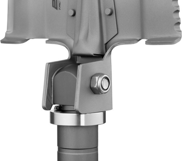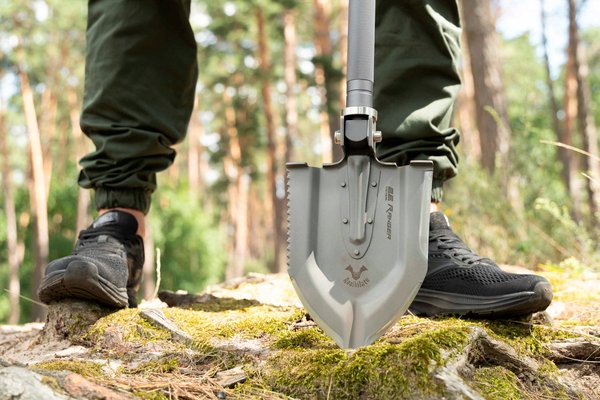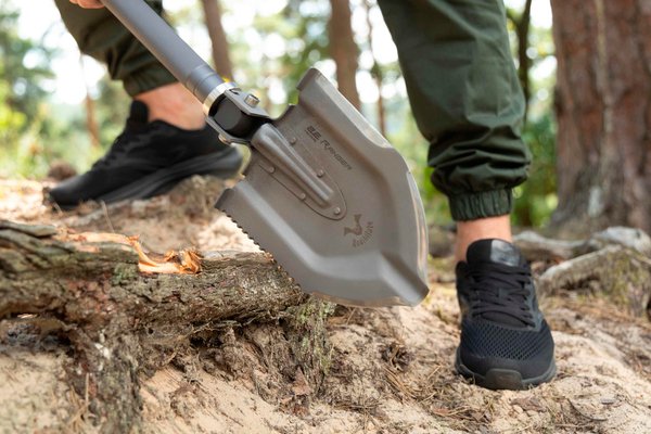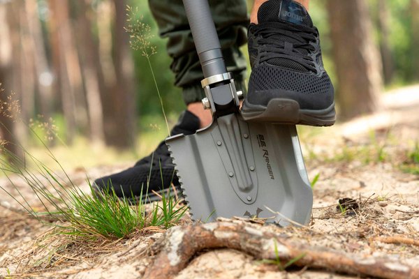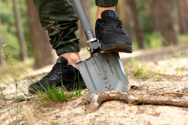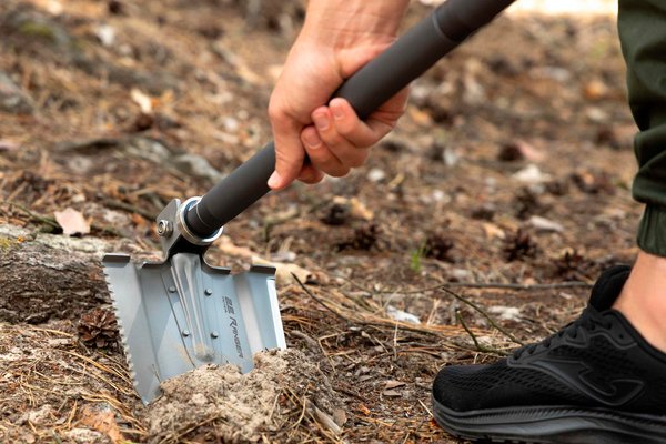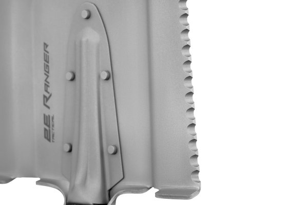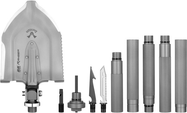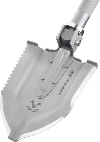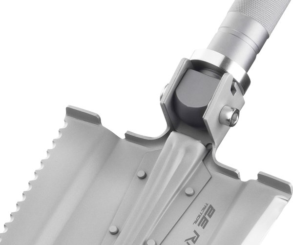 2E Ranger оснащена удобной складной рукояткой из авиационного алюминия толщиной 5 мм, поэтому она прочная и легкая, к тому же предусмотрена возможность ее наклона: на 30°, 90°, 180°, благодаря чему инструмент можно использовать как мотыгу, крюк и собственно лопату. Изделие пригодится для рубки, копания и забивания.