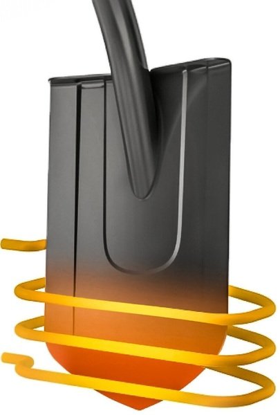 Работа в твердой почве облегчается, в частности, благодаря заостренным краям головки лопаты, которая соединена с рукояткой длинным и прочным сварным швом. Также немаловажным в этом отношении является прочный металлический упор для ног, который обеспечивает опору при вбивании головки в землю. Такая конструкция не только делает работу более комфортной, но и предотвращает поломку рукоятки во время работы.