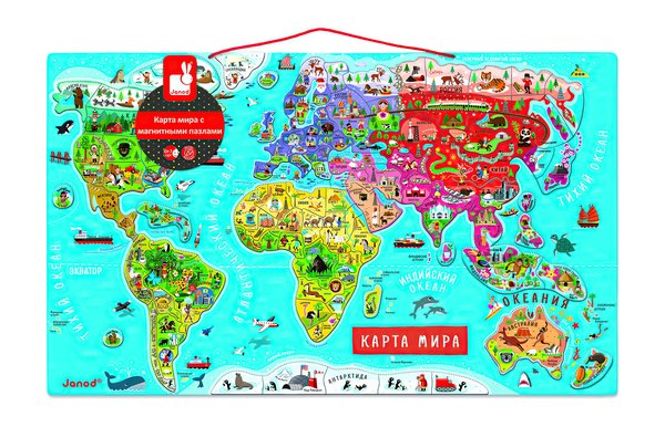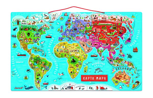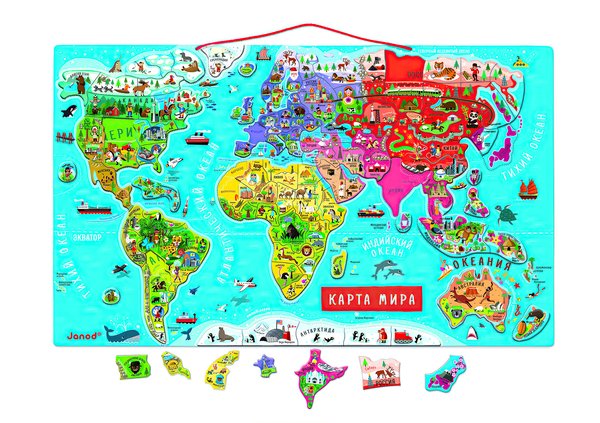 Для того, что бы ребенку было интересно и просто выучить названия стран мира я решила превратить это в игру и купила магнитную карту от Janod. Эта карта мира на русском языке, которая привлекла меня оформлением интересным и относительно небольшими размерами. Магниты не ослабевают со временем, ребенку очень нравится.