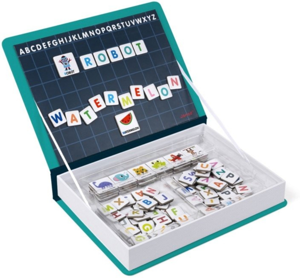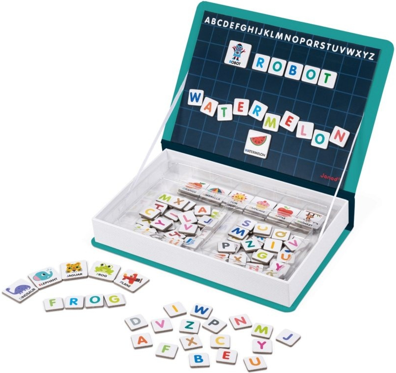 Магнитная обучающая игра для изучения алфавита на английском языке. Состоит из 26 иллюстрированных магнитов и 104 букв. Как только «книга» будет открыта, нужно правильно написать слово, которое нарисовано на карточке. Рекомендуемый возраст: от 3-х лет.