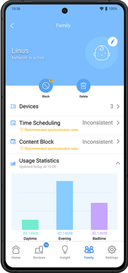 Контролируйте использование Интернета вашими детьми с помощью удобной графической информационной панели. Отслеживайте время пребывания детей в Интернете, объемы использования данных и активность на конкретных устройствах.
