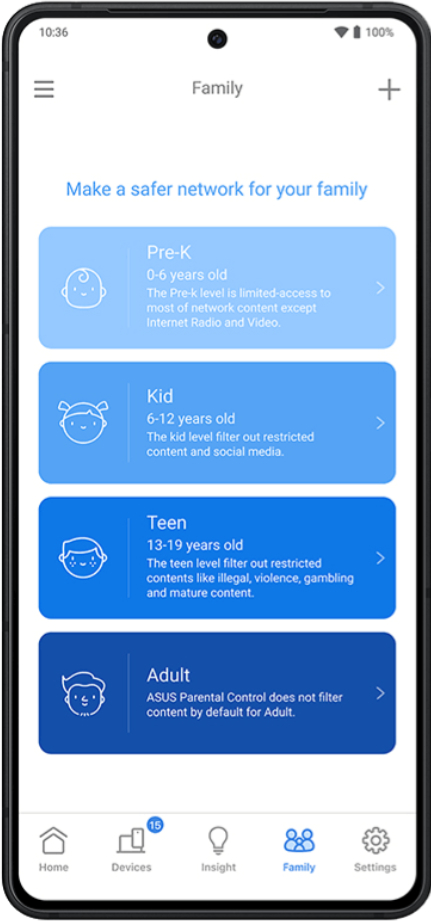 Предустановленные профили позволяют автоматически фильтровать неприемлемый контент и устанавливать расписание доступа к сети, что облегчает применение настроек в соответствии с возрастом детей.