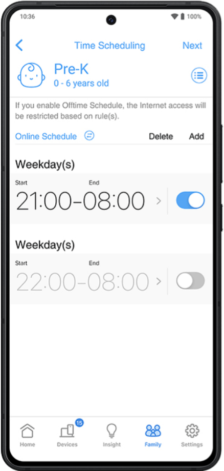 Определите часы онлайн и офлайн для каждого ребенка, чтобы сбалансировать его время пребывания за экраном и сформировать здоровые привычки. Поощряйте ребенка за хорошее поведение дополнительным временем в Интернете.
