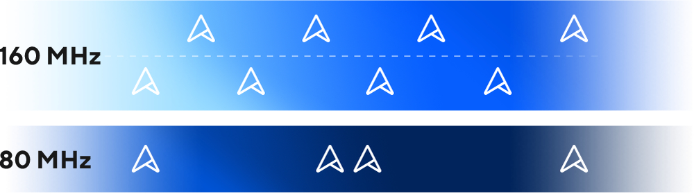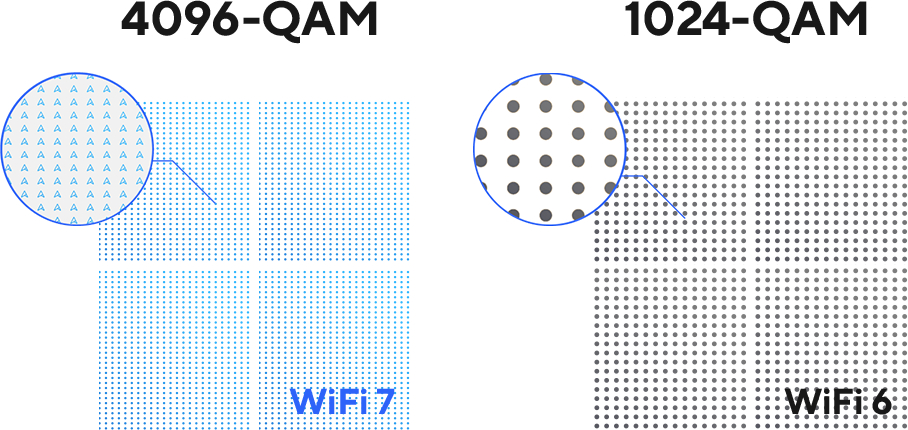 По сравнению с модуляцией 1024-QAM в стандарте Wi-Fi 6/6E, модуляция 4096-QAM позволяет каждому сигналу объединять больше данных, обеспечивая на 20% более высокую эффективность передачи данных.