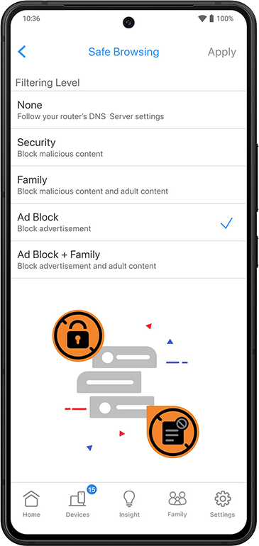 Настройте защиту для отдельных пользователей или группы устройств с помощью фильтров безопасности, чтобы обезопасить деятельность в Интернете.