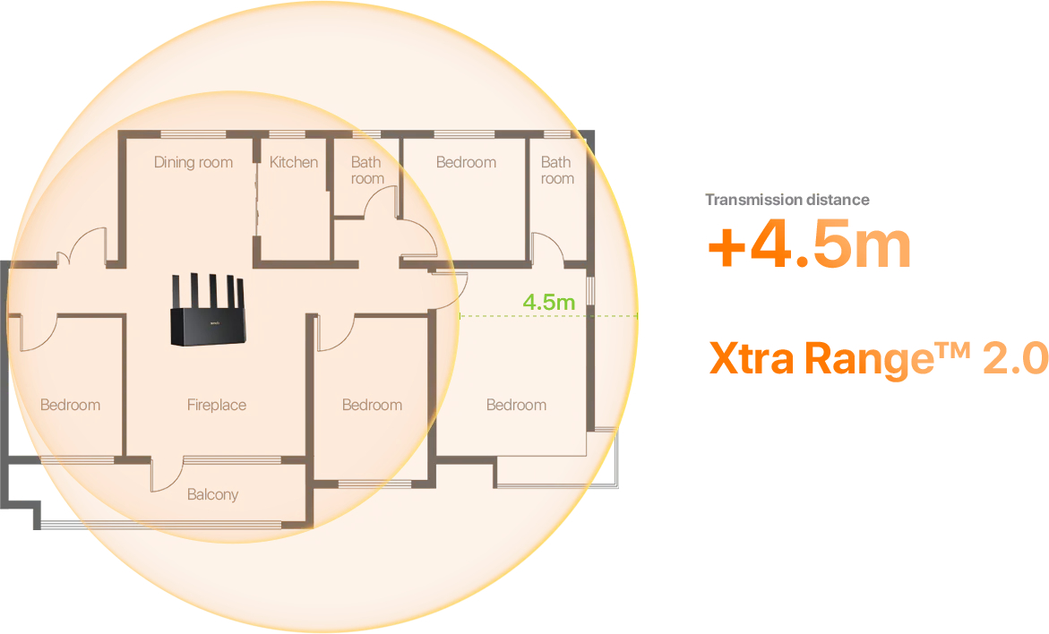 Благодаря технологии Xtra Range 2.0 покрытие сигнала Wi-Fi 5ГГц можно расширить еще на 4,5 м или пропустить сигнал еще через одну стену, сохраняя доступ к Wi-Fi даже в углу со слабым сигналом.