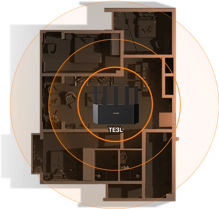 Tenda TE3L оснащен пятью всенаправленными антеннами с высоким коэффициентом усиления и пятью встроенными FEM-модулями, обеспечивающими покрытие сигналом Wi-Fi до 80-110м2. Если ваш дом больше по площади, вы можете добавить еще одно устройство, расширить сигнал одним нажатием с помощью функции Mesh+ и достичь покрытия Wi-Fi для всего дома.
