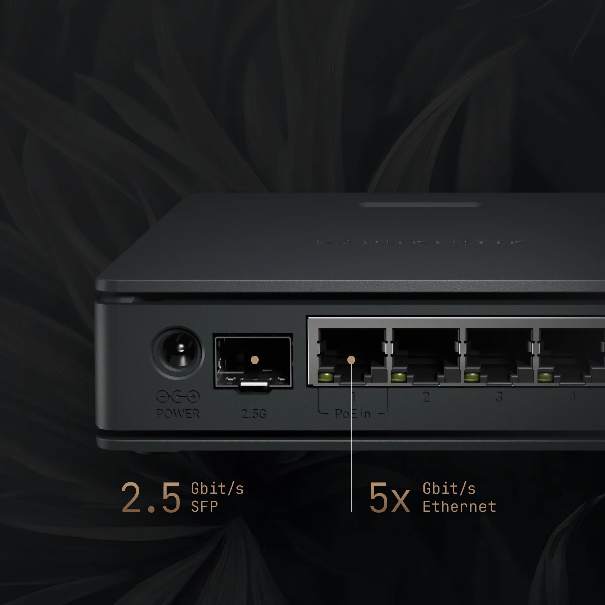 Пять портов Gigabit Ethernet и 2,5-гигабитный SFP-корпус. Вы можете подключить прямое оптоволокно к дому или подключить высокоскоростной NAS для молниеносного локального доступа.