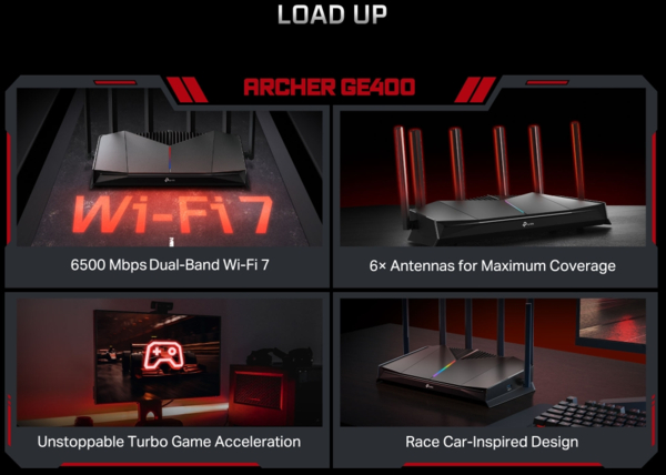 Archer GE400 — идеальное устройство с поддержкой Wi-Fi 7 для вашей невероятно плавной игры. Благодаря 4K-QAM и многоканальному управлению наслаждайтесь скоростью до 6,5 Гбит/с — для самого захватывающего игрового опыта!