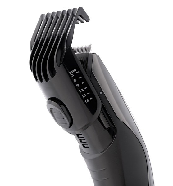 Эта универсальная машинка превзошла мои ожидания. Удобна тем, что одна единственная насадка имеет шесть положений для регулировки длины волос 3-6-9-12-15-18 мм и нет кабеля питания, она на аккумуляторе. Надел насадку на режущую головку и машинка готова к использованию. Работы машинки хватает до часа, довольно быстро заряжается - полтора часа где-то, плюс есть индикатор зарядки. Острые ножи и волосы не дерет.