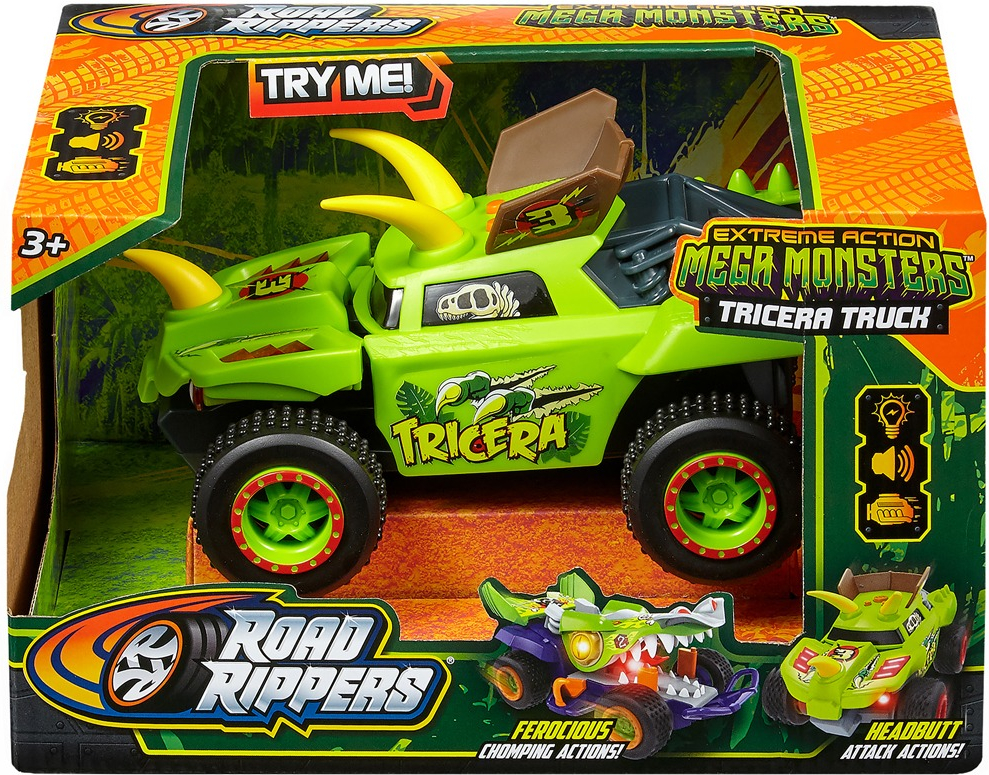 Машинка Road Rippers Tricera - это настоящий мега монстр, который сочетает в себе силу динозавра и элементы экстремального автомобиля! Мощный дизайн, световые эффекты и реалистичные звуки превращают игру в настоящее приключение для детей. Этот динозавр на колесах имеет уникальные возможности: движение, свечение глаз, звуки и даже открывается пасть, как у настоящего хищника.