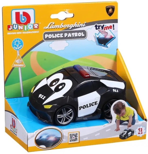 Машинка Bb Junior Lamborghini Huracan полицейская — этой машины достаточно, чтобы поймать злодеев и при этом выглядеть круто. Автомобиль оборудован рабочим освещением и сиренами, которые активируются при нажатии на световую панель. Размер машинки — 12 см. Для работы нужны 2 батарейки типа ААА (в комплекте). Рекомендований возраст от 1-го года.