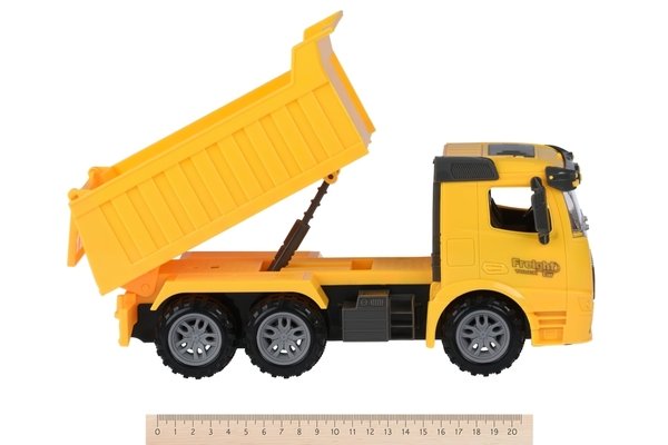 Желтый самосвал для заядлых любителей игрушечной автотехники. Автомобиль из качественного, прочного и при этом нетоксичного пластика. Игрушка, совсем как настоящий грузовик, - прицеп поднимается и опускается. Игра будет интересной благодаря инерционному принципу движения машины. Размер самосвала: 27х13х9 см.