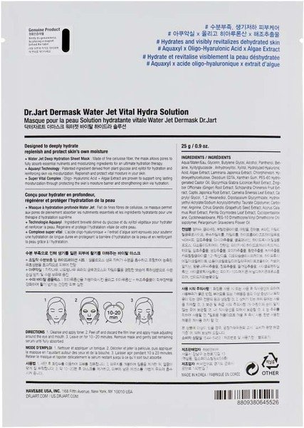 Dr. Jart+ Dermask Water Jet Vital Hydra Solution — интенсивно увлажняющая листовая маска для сухой кожи лица. Запатентованный увлажняющий комплекс Aquaxyl и ксилитол усиливает удержание влаги кожей и укрепляет ее барьерную функцию, низкомолекулярная гиалуроновая кислота увлажняет глубокие слои кожи. Экстракт морских водорослей поддерживает длительное увлажнение и повышает естественный синтез коллагена, чтобы ваша кожа выглядела и чувствовала себя гидратированной и полностью обновленной. Продукт прошел дерматологические испытания. Безопасная формула. Прошло тесты на раздражение кожи. Продукт не содержит парабенов, сульфатов, фталатов. Не содержит 10 вредных ингредиентов, таких как искусственная отдушка или красители, денатурированный спирт, триэтаноламин, поверхностно-активные вещества на основе сульфатов, триклозан, минеральное масло, пропиленгликоль и DEA, которые вызывают раздражение кожи.