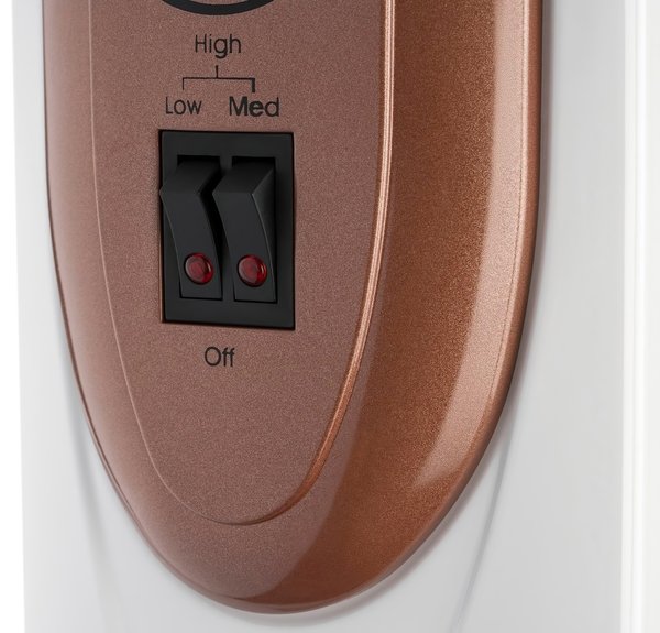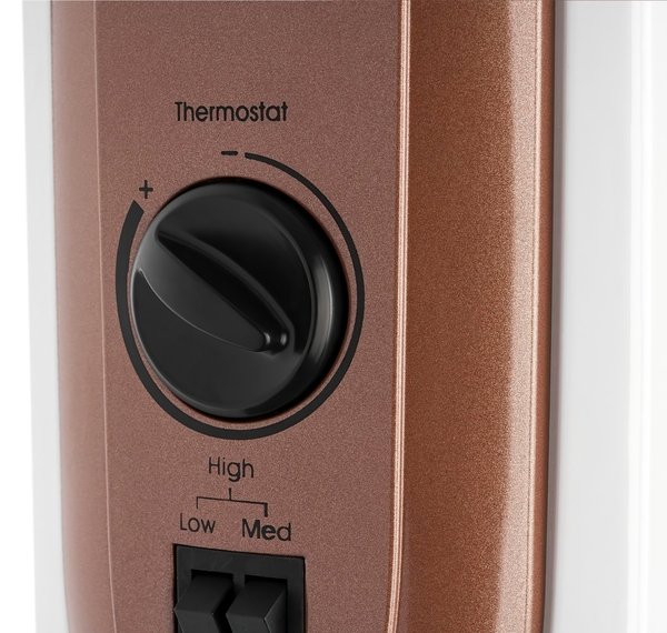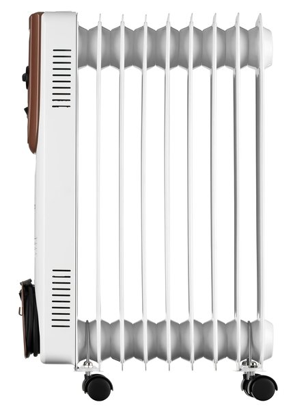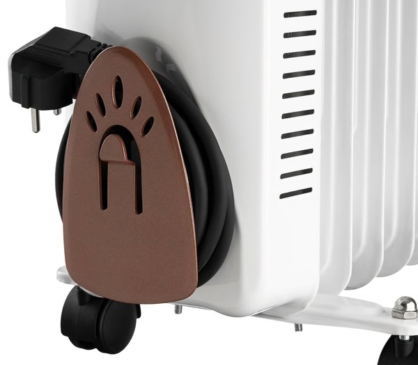 Масляный радиатор оснащен термостатом, позволяющим автоматически поддерживать заданный уровень температуры и специальным защитным ограничителем температуры корпуса. Это позволяет эксплуатировать обогреватель без постоянного надзора. Для удобства перемещения радиаторы оснащены колесными опорами.