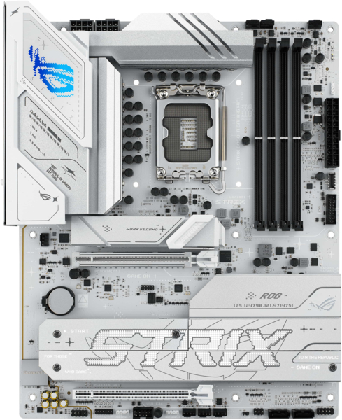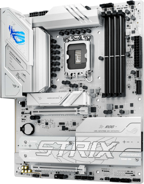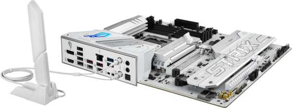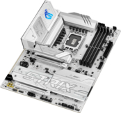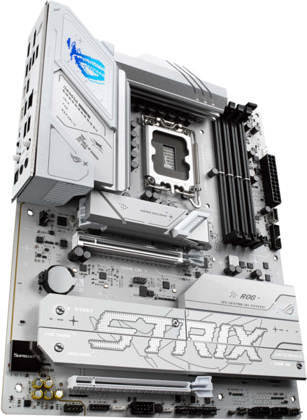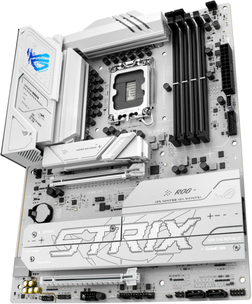 ROG Strix B860-A отличается оригинальным белоснежным оформлением, которое подойдет к любой сборке. Металлические радиаторы подчеркивают элегантный вид платы, а RGB-подсветка Aura Sync добавляет настраиваемые эффекты для создания персонализированного стиля.