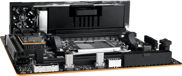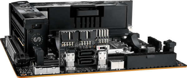 Для экономии места как встроенные слоты M.2, так и радиаторы расположены над чипсетом. А чтобы не допустить перегрева установленных высокопроизводительных накопителей, весь массив охлаждается встроенным вентилятором.